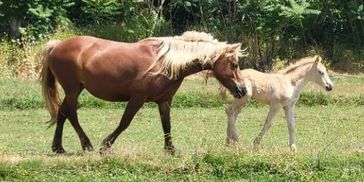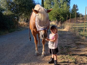 Nala is our Amish trained mare. She rides and drives, took time off to be a mom but is getting back into working. She loves her little humans.